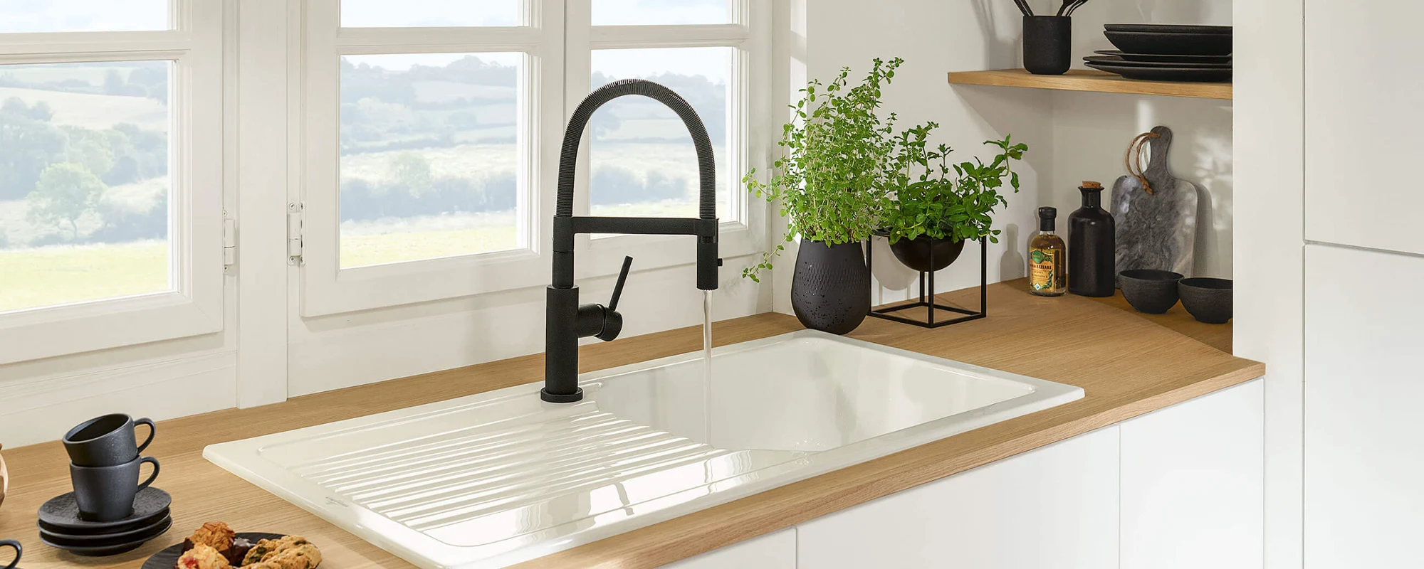 L’évier à encastrer s’intègre merveilleusement bien par le haut dans le plan de travail. Ainsi, le coin évier se distingue clairement du reste du plan de travail.